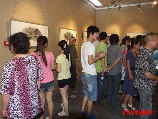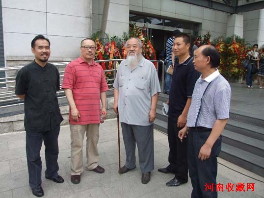 原河南省美协主席王威(中)闻讯也赶来参观展览,谢冰毅等出门相迎。