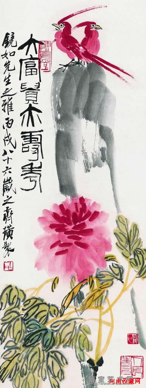 齐白石《大富贵亦寿考》、《大寿图》都是白石老人为友人庆寿创作的精心之作,《群虾图》、《丝瓜蜜蜂图》、《高山流水》则分别是老人在各个绘画门类的代表作品,均流传有序,著录翔实;黄宾虹家属所提供的数件宾虹先生画作,《蘧庐山居图》、《昭平山景》,代表了宾虹先生艺术生涯中的高峰;潘天寿《大吉图》、《八哥栖石图》展现了他学古风貌和自家品格,尤其《钟馗出行图》更是难得一件的人物画精品。这些画作汇聚成了本次拍卖会最大的亮点。