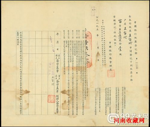 本次泓盛2011春拍拍卖的这枚“中国银行袁世凯戎装像股票”,是首度面世的流通实物,该股票的背面表格中盖有1956年10月19日“经本行核准继承过户”蓝色印文,另贴有1956年10月23日的第11930号“中国银行股票登记证”,其上均有中国银行总管理处印鉴,可见其合法性及真实性已完全由中行所认可。时值中国银行即将百年之际,这张最原始最经典的袁世凯戎装像股票之发现非但意义重大,而且更是见证中行百年沧桑的珍贵文物。