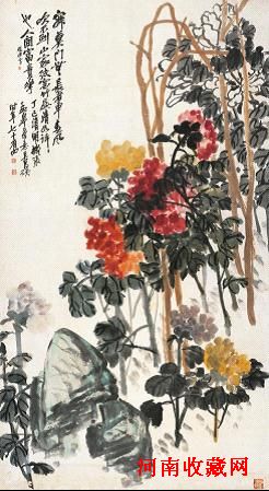 虚谷感染了任伯年的某些笔法,任伯年则在《华祝三多图》完成后的几年里结识了吴昌硕,吴与任遂此成了终身亦师亦友的关系。任伯年往往喜欢在颜料中施加胶或粉,有时使用几种颜料混杂但尚且能够辨认的色调——吴昌硕从任伯年那里所学的这两点无疑加添了他自身大写意花卉风格的形成。《花开富贵图》显示出吴昌硕这种风格的最典型面貌。花卉的整体经营大气而又稳重,可是每一处的设色及用笔却变化多端:时而色中带墨却不刻意调和,时而掺胶或者索性施以白粉,然而这并没有使画面变得灰暗浑浊,反而突出了当中重彩的几朵富贵花,暗处也显得彩墨交辉,层次丰富。吴昌硕使用西洋红而放弃传统的胭脂正是他风格的独创所在,厚重艳丽的西洋红经吴昌硕的大胆使用,似乎并不输给那些西方野兽派们的效果。《花开富贵图》是吴昌硕七十四岁的作品,此时距任伯年去世已有二十年之久,西方的野兽派却正是如火如荼地进行着,在此一年的清明时节,题上一首略带萧瑟的七言绝句,也不知他们彼此是否料想得到。
