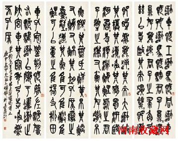 吴昌硕的绘画人人易懂,却几乎没有人能够达到如此遒劲的笔力,这恐怕得益于他在金石书法上的造诣。西泠拍卖每次都希望搜罗各类形式的吴昌硕书法作品,小到信札、诗稿,再到不同年份的对联,大到条屏、卷册,此次也均有佳作献拍。众所周知,篆书是吴昌硕在各种书体中最高的成就,而书匾则是吴昌硕各种书法形式中最为讨巧,也是最为稀有的。在当年吴昌硕自定的润格中,书斋匾正是价最昂的,甚至还加上“过大者不应”的条件。《篆书匾·君子若钟》既集合了书体与形式的优处,又书于绫本之上,且有日本方面的出版展览纪录,内容含蓄雅观,是殊为难得的匾书。