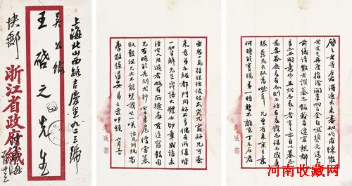 由王个簃家属提供的十数件作品中,包括吴昌硕晚年写给王氏的几种诗稿,其中部分笺纸用的是吴昌硕自制的汉画像砖笺,又有一通是吴老对于西方珂罗版美术书籍的褒扬辞,惹人可爱。沙孟海写给王个簃的一批信札多谈及吴昌硕以及西泠印社社内琐事,近三十通之间的内容几乎不曾间断。众多沪上名书画家诸如程十发、赖少其、亚明、沈柔坚、苏局仙等,均致王个簃大小题词诗稿,所涉多及王老八十岁画展一事。大量王个簃的诗稿、回忆录,以及致汪道涵、谷牧、黄若舟等书札底稿有极多回忆吴昌硕师门的内容,凡此种种不仅是研究吴昌硕师门的重要史料,在书法造诣上同样为人称道。