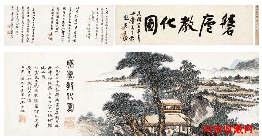 《盘庐教化图》的上款人是著名的上海九华堂南纸店的股东朱心佩。朱心佩号冰庵,民国时期与海上书画家多有来往,曾请众海派画家为其绘制《盘庐教化图》,一人所绘一卷,并由其统一样式装裱题签。再请时贤题跋唱和,所题引首的黄炎培正是上海滩响当当的政治人物,又是吴湖帆的亲戚。在半个多世纪以后,此图流转至吴湖帆的弟子陆抑非手中,由陆氏再请当年交往圈中的谢稚柳、陆俨少,以及程十发作跋,恐怕是众多《盘庐教化图》中最为人称道的一件了。