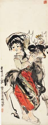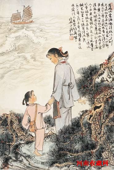 据冯超然讲,陆俨少在二十出头的时候已然可以仿作古画以假乱真,新中国以后,笔墨上的功夫更是绰绰有余。然而就在他的盛年时期,由于“中国画改造”的问题,以及政治上的错判,迫使陆俨少用一套最有古意的笔墨创作出最具时代意味的人物画来。作于1962年的《上学图》正是这类红色题材的代表作。腕下所及之人物、树石均表现出盛年时精到的笔意,书法长题也写的婀娜多姿,行气十足。若是遮去母女的衣物不论,他人还以为是明代吴门一类的名作。该画描述的是62年画家在广州地区的所见所闻,崖南一地新建小学校,人人得以入学,毕业后又可去当地水产中学深造,新开辟的国营农场使得当地的百姓“人人安乐,家给富足”,呈现出一派昔日非比的繁荣景象。然而这繁荣的一年对陆俨少来说实在并不寻常。自从57年被错划为右派,他便天天要去画院劳动改造,受到精神上的折磨,直至61年国庆期间,才得以摘去右派的帽子。数月以后,他正是受到浙江美院院长潘天寿的邀请,准备搬迁至杭州西子湖畔任教国画。此时的陆俨少,或许正如画中的女孩一样,想到可以从此去杭州悉心画艺,也不愿意揣测将来的艰辛,只消享受这单纯的喜悦之情。
