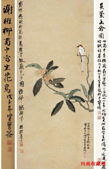 谢稚柳的《玉兰小鸟》作于四十年代初,其书法与花卉的面貌均深得陈洪绶的法度。谢稚柳在1942年又随张大千去敦煌临摹高古的壁画,所以画面往往充满了雅致的古意。据画中陈佩秋题跋所言,这种花卉是生长在蜀地的黄桷兰,树大花繁。而此幅正是谢稚柳在渝州时的写生之作,历经数年以后再赋诗补款。蜀地皮纸本来就相对蜡黄多筋,黄灿灿的兰花瓣在皮纸色泽的衬托下,好像双钩淡彩的墨兰一样,左右隐现,谢稚柳又学陈老莲的画法,在花的周围抹上与叶瓣一致的淡淡的墨绿,俏丽的花瓣一下子融在了整个折枝的氛围当中,也使得原本容易匠气的工笔花卉变得颇有文人意味。小鸟的白粉大概吃不进皮纸的质地,过了半个世纪便依稀脱落下来,恰好有家中人士再重新补上,倒也雅致可爱。