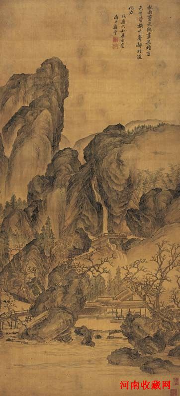 惲壽平的設色絹本《秋雨煙巒圖》亦不出隱逸題材。他雖明清易代之時才十二、三歲,卻仍忠於明朝,不事新朝,僅以鬻畫為業。作為“清六家”之一的惲壽平,以“沒骨”花卉獨步清代畫壇,然其山水則以“有骨”出現,形式雖不同,淡雅風格卻是一致,山水甚至更顯超逸。其早期山水近伯父惲向,取黃公望筆法,於荒率中見秀潤;中期山水,浸潤宋元諸家,漸脫刻板;五十以後,畫風趨於蒼老,兼取唐寅之法。此軸《秋雨煙巒圖》,如其自題乃“臨唐六如居士意”,卻呈露其自家風貌。以水墨為主,兼有青綠設色;畫面中林木石竹、峰巒溪流、人物房舍,皆深得“北宗”之筆法,又不失南宗之意境;尤其是秋樹青黃,或空鈎夾葉,或點色琢敷,僅以形態與色調的微妙變化,即營造出山澗林中豐富層次與靈動空間,韻味雋雅、曠然淡遠,實為惲畫山水中稀見之大幅佳作。