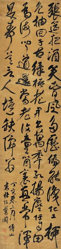 明末清初的文人雅士們身處易代之際,心懷故國之思,多以遺民自居。他們或歸隱不仕、堅守氣節,或遁入空門、潛心丹青,或致力抗爭、至死不屈。在這個遺民群體之中,以書法知名的即以傅山為首。明亡後,傅山為反抗清廷剃髮,拜壽陽五峰山道士郭靜中為師,出家為道;而仍以明朝遺臣自居,戴黃冠,穿朱衣,以示反清復明之意;亦以道士身份作掩護,流寓四野,進行反清活動。據《石膏山志》載,清順治四年丁亥(1647年)春,傅山和兒子傅眉到山西靈石縣天空寺演示打坐和五禽戲。綾本立軸《行書七言詩》即創作於該年三月。“張筵把酒笑春風,多歷偏能識化工。柳色抽回千古綠,桃花開出萬年紅。揚塵任自田為海,聞道還當老復童。箇裏真常渾是壽,莫言人境缺僊翁。”詩文里避世隱匿、悠然自得的情懷在率意而為、信筆盤旋的線條中纏繞、起伏、頓挫,令人感受到其狂狷之情與奇崛性格。傅山雖早年學趙孟頫墨跡,愛其流利圓轉,但終因趙曾事貳臣而嫌其字媚俗,並轉而崇尚顏體之書。此軸行書已顯現出顏真卿行書中的使轉筆法,為傅山於17世紀40年代末至50年代初書風轉變的重要佐證。