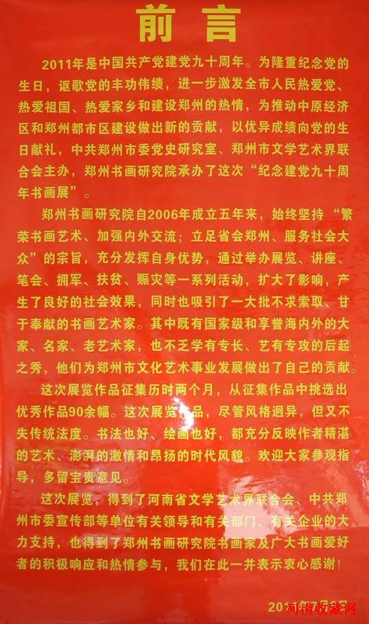 为庆祝建党90周年,2011年7月8日,郑州书画研究院在郑州市文联展览大厅承办了“纪念建党九十周年书画展”。本次展览由中共郑州市委党史研究室、郑州市文学艺术界联合会主办。
