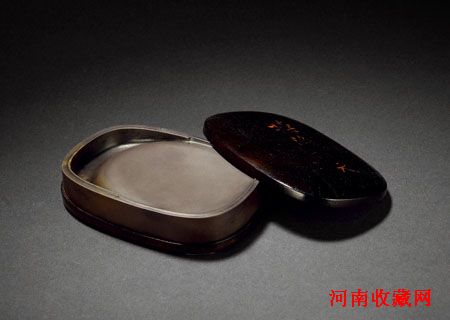 清·柏叶端砚、清·龙池砚著录于日本二玄社出版《古名砚》,柏叶砚形制别具,匠心独运,制者依势将之制为桃叶形,整片砚堂连为一体,周缘以叶边翻卷作棱,颇为精致。砚背制枝叶铺陈,脉络分明,意趣盎然。砚石色彩缤纷,砚面显两条金线横贯,火捺连片,砚额有硕大石眼,天成之睛,极为难得。