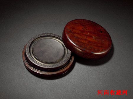 陆恢与吴大澄同乡,陆氏画艺高超、人品至诚,吴氏对其推崇过甚,曾诗赞曰:“廉夫德性比玉良,穷年雕琢成圭璋。精心密契娄东王,踵门索画多不偿。”直至延请家中作湖帆孙启蒙教师。此端砚随形而制,秀外慧中,朴素淡雅,文人气韵十足。砚质细腻,以手抚之旋即便有一层水汽结于砚面之上,叩之以辨其材,发湿木之声,端坑良品也。是年吴大澄五十七岁,七月与顾沄同游庐山,作《匡庐纪游图》,冬季,吴氏隶书铭此砚曰:“温润泽、寸心知、知书画、与君宜。愙斋为廉夫铭,翰卿刻。”又篆书红木砚盖:“廉夫画砚。愙斋持赠并题,辛卯冬月。”吴氏篆隶书古朴隽永,直接秦汉,而徐熙刻制极为精湛,铭文笔意毫发毕现。此砚足证吴大澄与陆恢并徐熙深厚友谊。