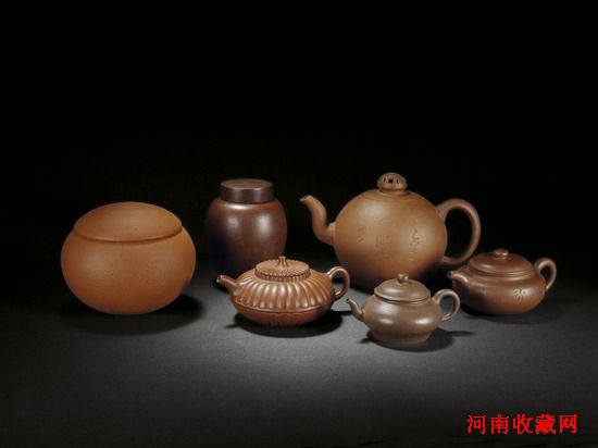 茶、香共宜。山遷草堂收藏各種紫砂茶具也頗具品位。陳用卿是明代製壺大家,所製紫砂選料上乘,工藝圓拙中見大氣,此件用卿款紫砂壺,壺身呈寶珠形,壺蓋上一鏤空錢紋半圓鈕,三彎壺嘴,壺柄壺嘴線條和諧。達到一種圓潤、凝重又氣韻含蓄的整體感。王南林製紫砂壺,三彎嘴、壺柄圓曲,中部向內微收,現出流動的美感。邵亨裕又名邵文瑩,師從明代紫砂大師時大彬,在茶具製作上也有相當造詣。此件邵亨裕款紫砂壺選料上乘,整體造型和諧勻稱。三彎嘴,製作作頗顯功夫,力度勁挺。另外清早期·菊瓣紋茶壺、王南林製紫砂茶葉罐、陳漢文款雷紋錦地茶葉罐都是紫砂類值得關注的佳品。