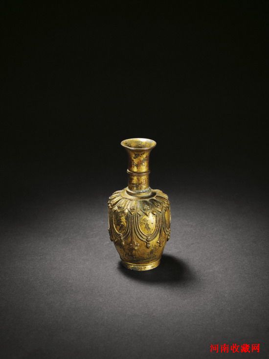 唐·銅鎏金淨瓶,一見便有唐代雍容之風,束頸、撇口,頸中部一圈兩條弦紋為飾,肩部為一周蓮瓣紋,其下飾以束帶。