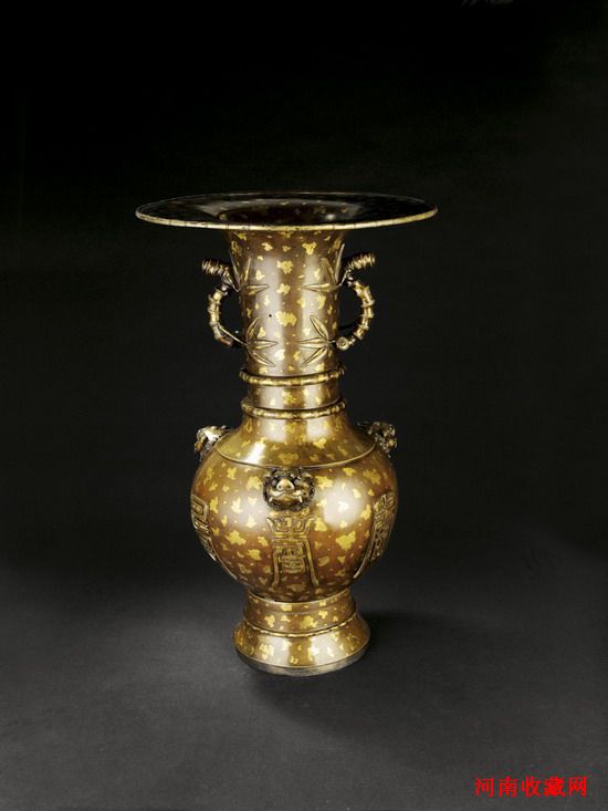 清·竹節耳點金瓶,口沿外張,雙竹節耳,頸部兩條竹節紋飾,通體片片點金。肩部一弦紋,下有三個圓雕售面耳。瓶腹均勻分佈六個篆體壽字。底部為宣德年製篆書款。