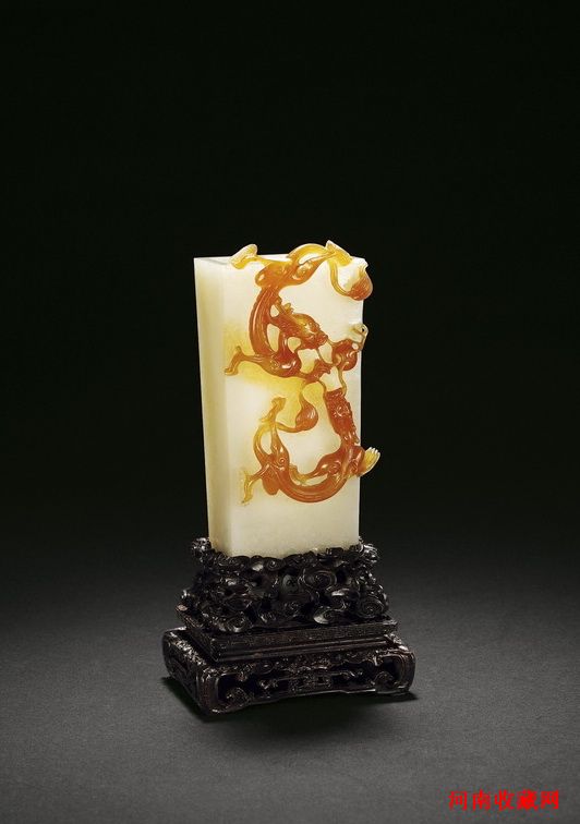 清·黃翡雕螭龍瓶。翡翠,綠者為翠、黃者為翡,此件以黃翡為材,瓶身全為白色,略呈長方,口、壁方正。瓶面以黃翡巧雕兩條螭龍上下盤繞共戲龍珠。這件雕件構思巧妙,巧借黃翡之美,匠心獨到。