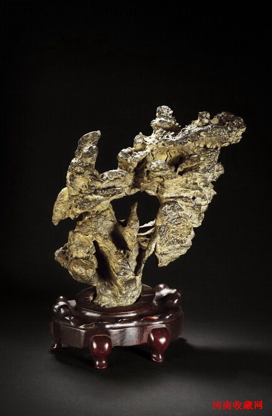 清·橫雲英石供石,如雲出深岫,一柱升騰而上,中部一隨形透孔,更為此石添彩,有若雲霧飄渺透空。由透空處向左右兩方伸展而開,其大的動勢卻左右共向一處,蒸騰橫斜,動態奇絕。