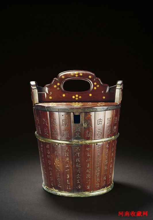 清·謝崧亭製竹雕壺套。由竹片相拼製成,每片皆刻滿文字,其外箍銅圈加固,其包裝瑩潤,字跡秀美,可為文房佳設。