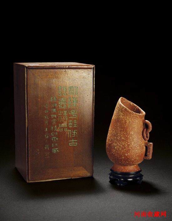 明·陳子畦仿古匏壺,紫泥鋪砂,壺色赭紅,砂粒大而金黃,俗稱“桂花砂”,古色古香。壺斜口,頸部彎曲,橢圓形腹,背上置銜環鈕耳和方形耳,圈足外撇,式樣仿造戰國至漢代流行的匏壺。整器似攲不攲,曲線圓轉流暢,顯示出一種活潑柔順的美感,可謂柔中寓剛,圓中有變,厚而不重,穩而不笨,比例諧調,轉折圓潤。有骨有肉,骨肉勻稱,於變化之中求穩重。胎土精選優質紫泥,鋪砂顆粒粗細不一,器表凹凸不平,層次豐富。鋪砂技法始於明代萬曆年間紫砂大師陳仲美,即成型後的紫泥坯體表面撒上細砂,然後用工具拍打,使之嵌入坯體表面,利用泥色對比呈現出珠粒隱現、光閃奪目的效果。在紫砂壺中還有程壽珍、周桂珍等名家作品。