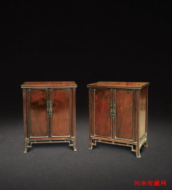 清早期·黃花梨櫃一對,黃花梨木質,紋理細膩,呈現黃褐淡雅色澤,材質上等。櫃面為四面攢框內嵌獨木,櫃帽內挖門臼,可嵌入門扇軸,自由開合。門及軸上嵌有帶紐頭與吊牌的三排長方形面葉,為光素櫃身的唯一裝飾。腿自頂端向底部逐漸由直線漸變為外撇狀,邊脊起線。櫥櫃及抽屜可放置書籍、畫軸等文房物品,成對匹配,具有良好的收納性能,為文房陳列佳器。
