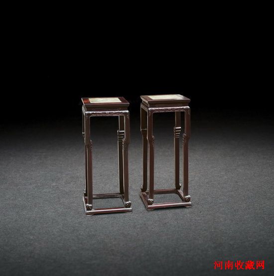 清·紫檀花幾一對,形體挺拔俊朗,四面攢框鑲雲石面心,冰盤沿面,面下束窄腰,腰上開炮仗眼,牙板如披肩般覆蓋腿足,三彎四方腿,外翻馬蹄足,腿下由帶小足的托泥支撐,造型古樸大方。所嵌雲石綠色斑駁,間雜灰色,色調凝厚深幽,猶如一潭春水。牙板上壓地淺浮雕兩組相向的簡化夔龍紋,拐腿處浮雕勾雲紋邊飾,雕工細膩,刀法舒爽朗健,線條流暢自然,古色古香。