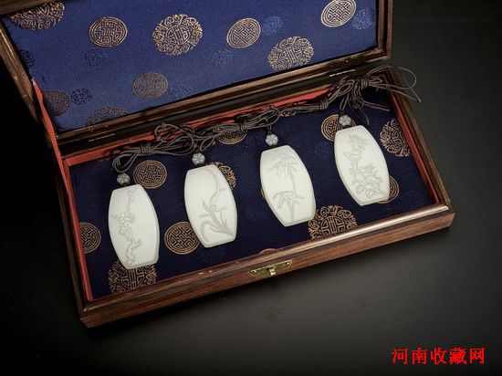曹杨自小研习书法绘画,能将玉雕与书画艺术融会贯通,因此作品意境深远,回味无穷。曹杨《四君子》套牌,取材中国画中最常见的梅兰竹菊,采用折枝构图,画意十足。梅兰竹菊是中国画中最常见的题材,因其傲、幽、坚、淡的品格成为中国人感物喻志的象征。同时也是最多用于学习花卉入门的题材,以至于人们多有一种误解,认为梅兰竹菊是花鸟画中最基本最容易的。其实,看似简单的东西却往往是最难的,所谓神鬼易而犬马难。有句话叫做十年画竹,一生画兰,兰竹之类最见作者功夫,因为这类题材完全靠的是线条功力,稍有懈怠,妍媸立见,非功力深厚者不敢轻为。曹杨的这四枚玉牌,画面层次、虚实、奇正、疏密皆无可指摘,而且见刀见笔,看的出作者在绘画方面是下过大工夫的。配以背面行、楷、隶、篆四种书体铭文,更是文气十足,是玉雕与书画结合的佳作。