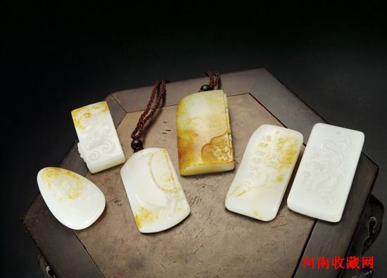 因为成双成对的吉祥寓意,对牌为越来越多的人所喜爱。龙凤是对牌中比较常见的题材,作为上海苏州两地玉雕的代表人物,易少勇与蒋喜两位大师将相同的龙凤题材做出了截然不同的味道。易少勇的《锦羽升云》用传统写实的龙凤图案,其余一无装饰。背面用隶书阴刻“升云出鼎湖,清泉百丈化甘霜;锦羽栖梧桐,长空九霄为彩云”十二字龙门对,整体素雅含蓄;蒋喜则把一对《龙翔凤翥》玉牌分别做成长方与水滴形,图案采用古代玉器中的变形龙凤纹,集龙凤纹与一牌,面龙则背凤,面凤则背龙,阴阳相生,构思巧妙,并以谷纹、铺首等装饰,显得精致华美。同样是苏工的代表,杨曦的《相映成趣》对牌可谓是别出心裁,自古民间以龙凤呈祥喻男女和合,他巧妙的利用男女衣饰的差异,将两枚玉牌做成如同男女两张图片的局部,一方正一圆转,一刚健一婀娜,如此立意,真令人拍案叫绝。另一件水乡牌以浮雕和块面的表现形式,描绘江南水乡,温润洁白的玉料,虚实相映的楼阁轮廓,蜿蜒的卵石小径,仿佛清晨薄雾中的江南古镇,透出一份宁静,流露一份浓情。
