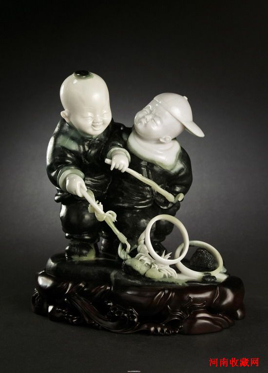 独山玉出河南南阳,南阳玉雕的根也在河南。中原文化厚重沧桑,南阳玉雕植根于此,却如老梅枝头,嫣红一点,夺人眼目。独山玉色彩丰富,一块玉料之上常有多色混生,而独山玉雕的俏色运用也因此独步当今。张克钊的独山玉雕《转动的童年》是一件充满童趣的作品,完美的俏色,传神的刻画,将我们带回到那遥远而亲切的童年,“轱辘轱辘圆,滚铁环,摔了一个跟头,捡了一分钱…”当年的童谣,如今还有几人记得?经历了几十年的世事,我们不再为一点小事而轻易的喜或者悲,我们觉得自己成熟了。可是,细想一下,我们身边还有几个能让我们为了一颗糖,几粒花生,或者一次滚铁环的胜负或喜或悲的朋友?童年渐渐远去,儿时的玩伴也渐渐老去,只有那滚动的铁环,依旧曲折向前,铃铃作响。