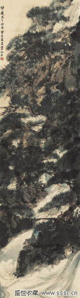 傅抱石先生自1939年至1946年秋,即其36岁至43岁的八年间,一直居住在四川重庆郊区金刚坡下农舍,金刚坡的名声是随着抱石先生的佳作而被人们所熟知的。这幅《松山寻泉图》作于1943年即他居住金刚坡的第五年,此时抱石先生正处于变法时期,与之前较为传统的笔墨有所不同的是所谓金刚坡时期。看画面漫天飞瀑,山树掩映、曲折而下,气势磅礴,恢宏浩然之气生焉。画面浑然一体,反映作者的意境、诗情。