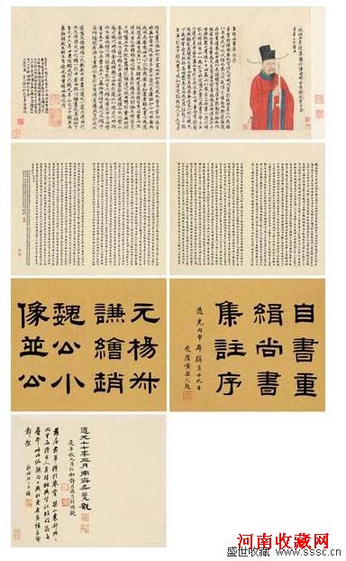 另一件颇为精彩的作品是赵孟頫、杨叔谦书画合壁孤本《重辑尚书集注序言》,此作最大亮点是著录、出版多达20次,如此佳作,不容错过。序文26行552字,加前款2行24字,共576字,全序用行书小楷书成,用笔沉稳、潇洒,写于赵氏典型的专用纸(紫丝栏蚕茧纸,中缝有“松雪斋”三字印记)上,以东晋上清道士杨羲的书风为基调,又融入二王 ,并出意于李北海,可谓是晚年鼎峰时期的力作,其子赵仲穆在其后跋中亦称是册“精而益精者也” ,其画友提举杨叔谦并为其画朝服像,画史虽有杨氏作品的记载,但从海内外现存的所有书画出版物及各大博物馆中均无其作品的影像,故此小像应定为杨叔谦传世之孤本,其价值亦非寻常,赵承旨书杨提举画,实属珠联璧合相得益彰之作。这件赵孟頫书法名作的现世对研究赵氏书风具有极为重要的意义,藏家当宝之。