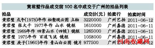 观察近年黄君璧作品在拍卖市场中的情况可发现,在成交价前100件中,72件成交于2011年;大多数拍品均成交于北京、上海、中国香港,只有6件成交于广州本季大拍。其中《松壑观云图》以322万元成交,成为广州艺术品拍卖市场中的历史高价。
