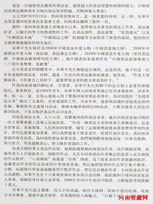 宋华平 1955年1月出生于河南省确山县,祖籍山东泰安。郑州大学汉语言文学专业毕业。河南省书法家协会主席,中国书法家协会第四、五、六届理事,中国书法家协书法培训中心教授,河南省政协常委,河南省文学艺术界联合会副主席,郑州大学书画名誉教授。