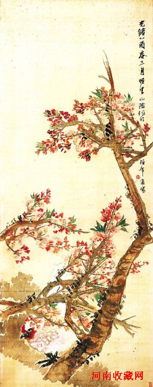 记者前去探求。在深圳博物馆老馆库房的三楼,一个柜子层叠、架子林立的库房里,馆员张冬煜戴好白手套,缓缓拉开抽屉,双手小心翼翼地捧出《桃树白鸡图》的画轴,穿过外间,通过走廊,来到右边宽大的展示室,把画轴轻轻放在天鹅绒的工作台面上,与另外的两名馆员相配合着,缓缓展开任伯年的画作《桃树白鸡图》,供本报记者欣赏。画面所写,为桃花树下张扬着大尾巴的一只白鸡,构图简洁,用笔粗放,鸡由白粉点染,从而呈现出羽毛蓬松的质感,画幅以黄绫为边缘,裱制得相当精致。左上角题“光绪乙酉春三月将望山阴任颐伯年画写”,张冬煜解释道,“光绪乙酉”是1895年;“望”就是阴历十五,将望,就是将要到阴历十五;“山阴”,是任伯年的籍贯,山阴在浙江,也就是今天的萧山;任颐伯年,就十分好解,姓任,名颐,字伯年,那么这幅画是他在那一年的三月中旬所作。上述题款旁有印章“颐印”,也就是任颐的印。