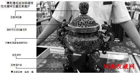 昨日,在沈阳举行的一场夏季艺术品拍卖会上,一件清乾隆掐丝珐琅缠枝花托吉祥双夔龙耳盖炉拍得80万元人民币。