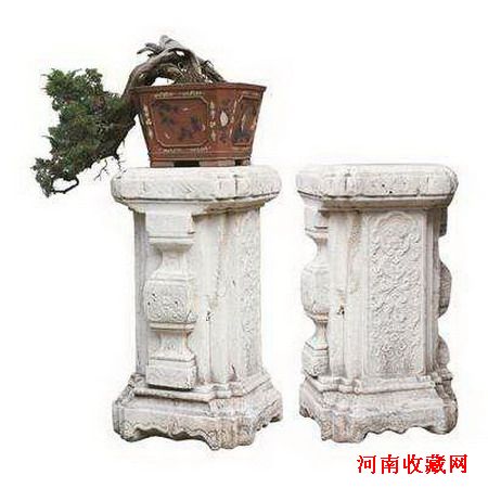 清•汉白玉皇家四面工西洋番花净瓶石台一对