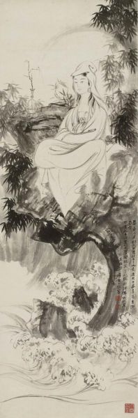 本专场业已汇聚了齐白石、张大千、溥儒、陈少梅、任熊、吴昌硕、王一亭、弘一、谢稚柳等近代绘画大师精心创作的佛教题材绘画精品百余件。其中张宗宪旧藏齐白石《阿弥陀佛》造龙藏寺阿弥陀佛立像。佛祖凌驾于祥云之上,左手托莲台,右手垂下施接引印,生动传神,系白石老人心中之佛的写照。出自“寄畅园专拍”的张 大千《水月观音》是大千仕女画的延伸,观音倚于竹林峭壁之上仪态万方。吴昌硕《达摩面壁》具备台湾历史博物馆早年出版,其山惟石,壁立千仞,达摩悟道其中,天地浑成。