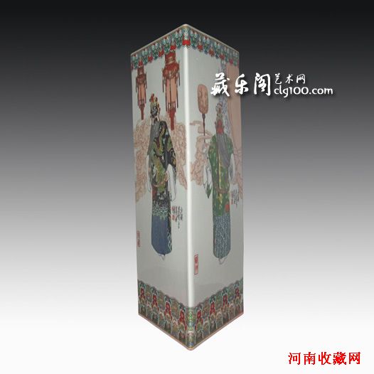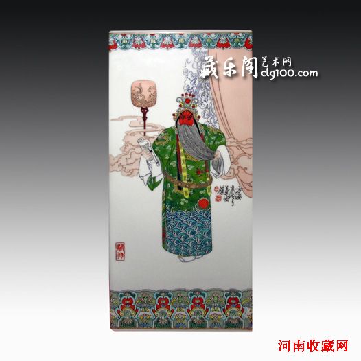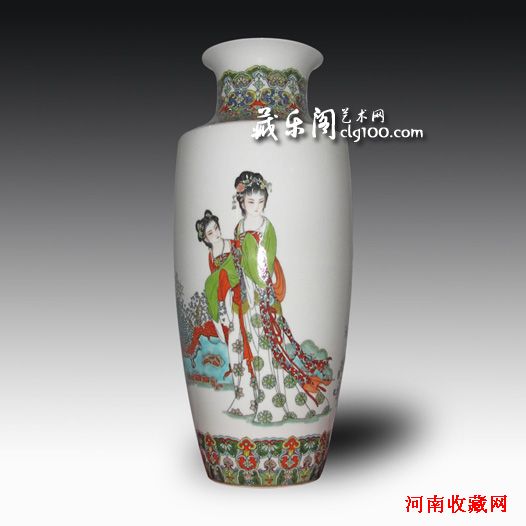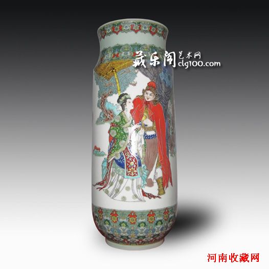名家鉴赏:《西厢记》是我国家喻户晓的古典戏剧名著,它叙述了书生张君瑞和相国小姐崔莺莺邂逅相遇、一见钟情,经红娘的帮助下结合的爱情故事。方复老师熟悉历史典故和民间传说,把民间故事融入于瓷瓶中。他笔下的仕女,体态婀娜多姿,衣物纹饰色彩红绿分明,层次较少,彩色鲜明透彻。