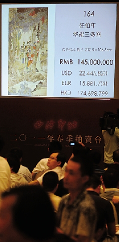 7月16日,时值西泠印社2011年春拍首拍开场之际,上午9点10分,记者到达拍卖会场杭州世贸君澜大饭店,从通往三楼拍卖会场的电梯口等待上楼的密密麻麻的人群,就感到今年西泠春拍的火热。进入会场,果然已座无虚席。随着时间的推移,会场的人越来越多。9点半,首场拍卖西泠印社部分社员专场开拍,环顾四周,此时的会场已被挤得满满当当,周围的过道也站满了人。开场后,拍卖不温不火地进行着,直到68号拍品傅抱石的《风雨归舟图》上场,掀起了第一轮高潮。《风雨归舟图》以250万元起拍,经过轮番竞逐,最终以1000万元落槌。12点左右,场内后排席地而坐的人都纷纷站了起来,而原本由于人多而嘈杂的拍卖现场瞬时变得异常的安静,原来是全场重彩之作的任伯年《华祝三多图》准备开拍。当拍卖师喊出8000万元起拍,还没有等大家反应过来,价格就因场内的4位买家齐齐出手而杀到了一亿元。随后,有两位竞拍者退出,焦点随之落到了前排一位男士与后排一位女士的争夺中。过亿元后,竞拍者加价的过程显然要谨慎许多,因为,一次出手就是500万元。而拍卖师也给了两位竞买者更多的考虑时间。1.3亿、1.35亿、1.4亿元,两人的价格一直咬得很紧。在僵持了约5分钟后,最终以后排一直戴着耳机进行着电话交流的877号女士,在报价1.45亿元后落锤告终。(加上佣金以1.67亿元成交)