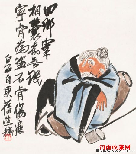 齐白石人物题材作品因其题材诙谐,笔法凝练,数量稀少,而一直受到广大收藏者的追捧和喜爱,从款识“白石自更旧造稿”可知,同样的题材,齐白石画过不止一次,可见他对这个题材的喜爱。虽然常画,但他也要在形式上做到不雷同,富有变化,他将书法的笔法与篆刻的刀法融入绘画的线条,使画更有压缩性,线的质量更加凝练。