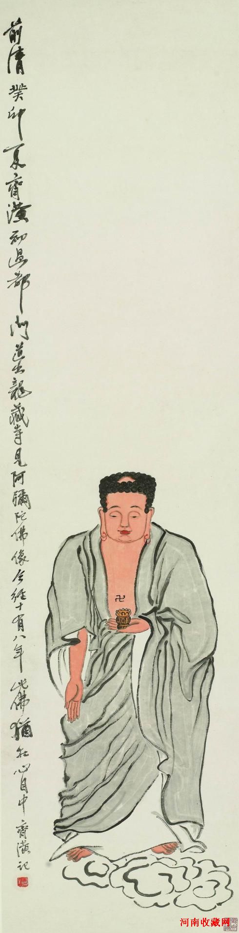 《阿弥陀佛》摹造龙藏寺阿弥陀佛立像。佛祖凌驾于祥云之上,左手托莲台,右手垂下施接引印,生动传神,系白石老人心中之佛的写照。《阿弥陀佛》摹造龙藏寺阿弥陀佛立像。佛祖凌驾于祥云之上,左手托莲台,右手垂下施接引印,生动传神,系白石老人心中之佛的写照。