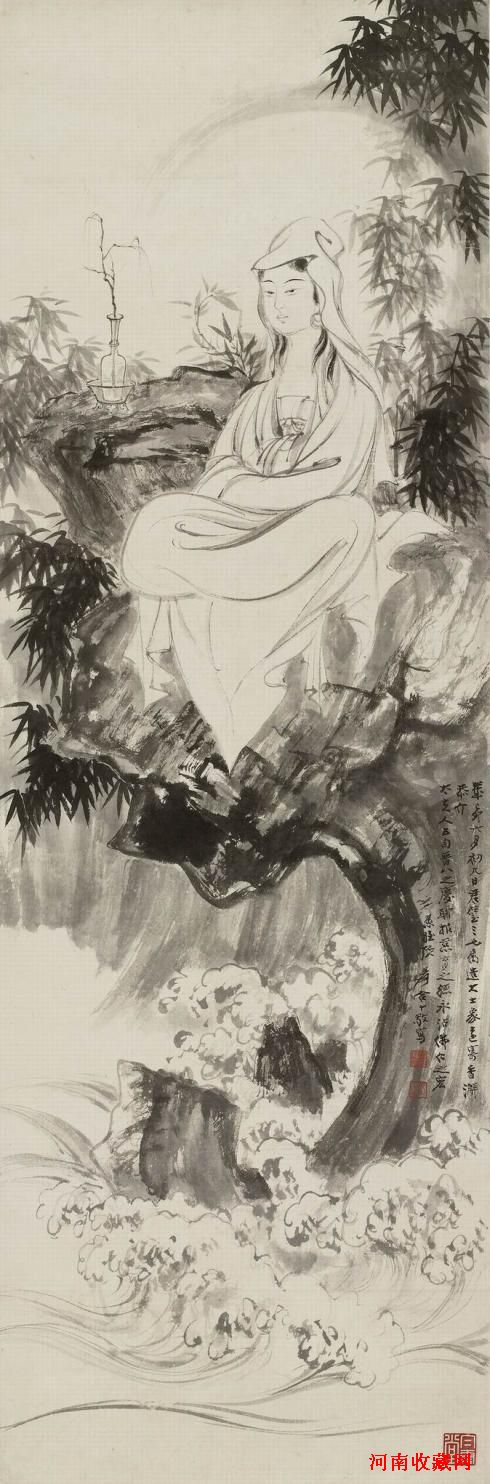 张大千《水月观音》以水墨写意手法描绘,先以淡墨勾出观音轮廓,之后以稍浓的墨线再次加以勾勒,使开脸及衣纹显得精神有灵性。构图上,观音笼袖而坐,其下为巨浪岩石,四周布满修竹,人物右边岩石上置净瓶一个,上插杨枝。整幅画面使人感受到慈悲清雅的意境。