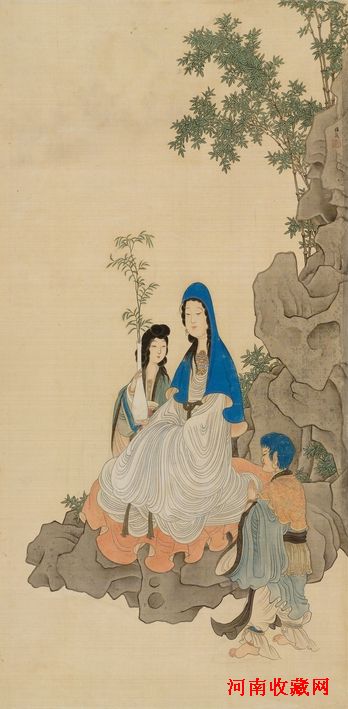 海派代表任熊《观音大士》。任渭长此幅观音工笔重彩绘于绢素之上。观音开像古穆静谧,两侧龙女与善财童子眉目清晰。人物衣物皆以高古游丝描,线条劲挺,转曲自然。背景洞石空勾无皴,以墨渲染浓淡以别向背。旁衬翠竹双勾填彩。虽历一个半世纪,然绢素如新,敷色秾丽,堪称绝品。