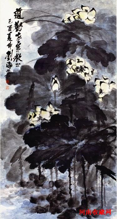 拍卖号为53号的拍品为刘海粟款的《荷花》,钤印:刘海粟 曾经沧海,题识:道勤老弟教正 己酉(1969年)夏仲刘海粟。刘海粟:(1896-1994)江苏武进人。学名季芳,号海粟,晚号海翁、静远老人,室名艺海堂、存天阁。曾任华东艺专校长,南京艺术学院院长,意大利国家学院院士,并获美国世界大学文化艺术博士称号。为中国美协理事、全国政协委员。