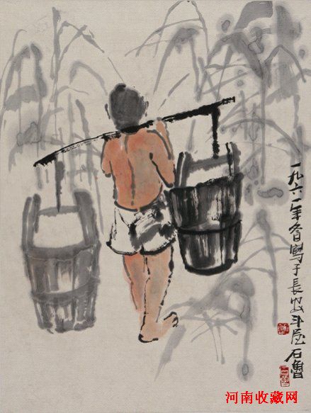 拍卖号为60号的拍品为石鲁款的人物立轴,钤印:石鲁,题识:一九六一年冬日写于长安斗屋石鲁。从这幅作品看,素材的单纯,更加突出笔墨的凝炼、老辣。画家率性任真,不假雕饰,虽然仅是寥寥数笔勾勒出一个挑水人的背影,但却能让人感受到直泻性灵、纯朴无华、无法而法的境界。