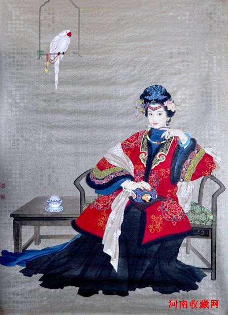 拍卖号为106号的拍品为王美芳的绢本工笔仕女《王熙凤》。王美芳,是一位擅长工笔人物画的丹青妙手,尤其是她笔下的古代仕女形象。这幅《王熙凤》,造型准确,构图严谨,描绘精细,色彩清雅,风格唯美。构图清新,应为王美芳老师的精品。画面左上角有一只白毛鹦鹉,站在考究的架子上。画面主体是王熙凤衣着华服,倚坐于圈椅之上,雍容华贵,英气逼人,生动传神。作者功力深厚,观察细致入微。