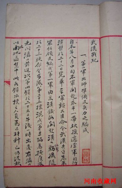 《武汉战纪》手稿为熊炳琦手撰,长29厘米,宽20厘米,封面墨书“武汉战纪”四字,全书共十六章、162页,约两万三千字。熊炳琦为北洋军政要员、武昌起义后,随冯国璋赴前线镇压,任第一军司令部机要参谋官。此战纪详细记录了清朝新式军队——北洋六镇开赴武汉镇压辛亥革命的历史,为现存唯一的一部由清军参战高官记录镇压武汉辛亥革命全过程的内部手稿,且以“日记式”记录了清军镇压武汉辛亥革命的全过程,对事件发生时间、状况记述精确详尽。据悉,此手稿目前估价为180万至220万元人民币。