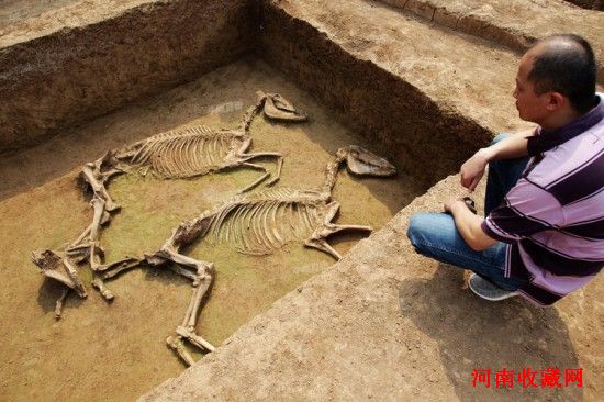 东北侧的两座马坑坑结构一致,各埋有两匹马和一条狗,这些马和狗的骨骼非常清晰,马呈靠背侧卧状,狗在两匹马的尾部。
