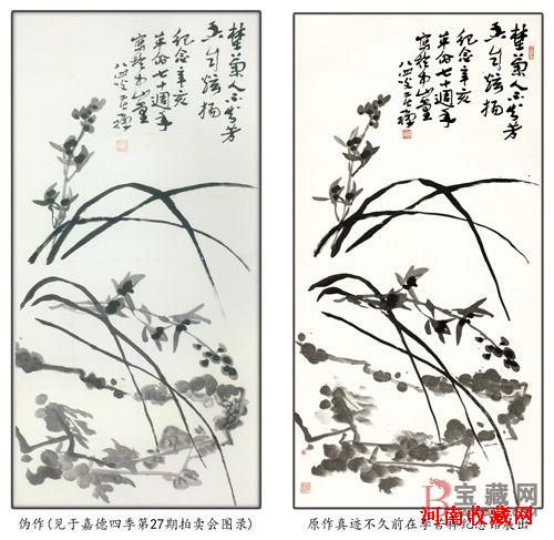 两幅《兰石图》对比照片,右图为真迹。(李苦禅网站供图)