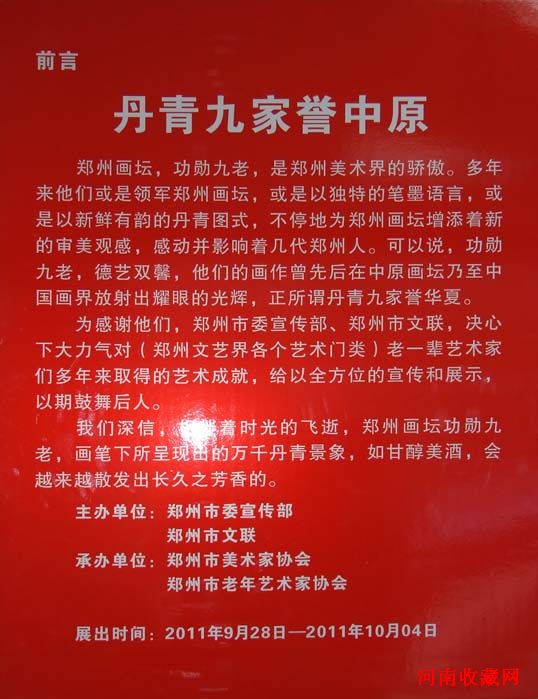 本次展览由郑州市委宣传部、郑州市文学艺术界联合会主办,郑州市美术家协会、郑州市老年艺术家协会协办,共展出龚柯、唐玉润、王天佑等九位老画家的近百幅作品。