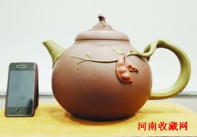 根据容量,紫砂壶一般分为小品(容量200毫升以下)、中品(200亳升至350亳升)和大品(容量350亳升以上),至于1000亳升以上的“巨壶”,由于制度难度较大,烧制过程中易变形,名家作品颇为少见。然而此次拍卖会,宜兴名家竞相“斗艺”展绝活,竟有多件1000亳升以上“巨壶”亮相拍卖会。如中国工艺美术大师吕尧臣特地为此次拍卖会制作的一把《大素心壶》。这件《大素心壶》的容量达到3000毫升,作品工艺绝伦,壶把似藤蔓天然生成,上面悬挂着两枚俏生生的扁豆,几可乱真,壶纽恰似瓜蒂嵌按,野趣盎然。范志军介绍说,这件《大素心壶》是吕尧臣大师生平以来制作的容量最大的一件花货,前后花费了一个多月的时间。用吕大师自己的话来说,制作如此“巨壶”对他也是一次挑战。江苏省工艺美术大师吕俊杰制作的《紫气东来壶》,不仅容量达1000亳升,而且集绞泥、雕塑、泥绘、镶嵌等多重工艺融为一体,也是极为罕见的。