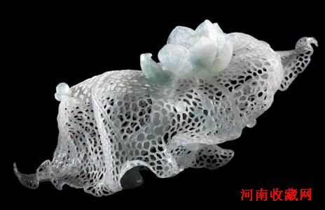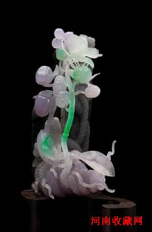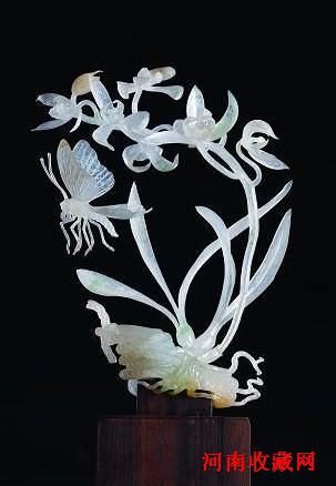 福从天降:一只蝴蝶从天而降,「蝴」与「福」为谐音,作品因而得名。罕见的三彩翡翠水石,质地细腻,明莹洁净。以精雕巧作、琢摩极薄的技法,呈现报岁兰高雅秀逸的丰姿。