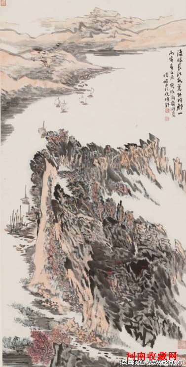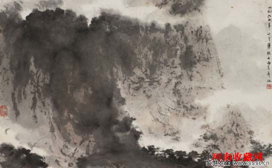 傅抱石的《庐山胜景》也是本次秋拍的精品佳作之一,该作品创作于1964年,此时傅抱石的山水画,不再是简单的“师自然”,而是以其独特的“抱石皴”,在挥洒笔墨情趣的同时,寄托着自己复杂的情感。此画从大处着眼,表现登庐山之意境,空灵开阔,绘一山之半腰,烟云缭绕,寺庙及僧人隐逸其间。近处山峦以抱石皴法擦成,笔法纷繁,似无法而有法,远山用半干半湿之笔迅速落下,雄健洗练乱而有法,一任情绪之摇曳,空旷飘逸。山脚蒸腾而起的云雾,将山势衬托得如名山大川。虽画尺幅不大,却气吞山河,大气磅礴,直抒诗词精髓之意。